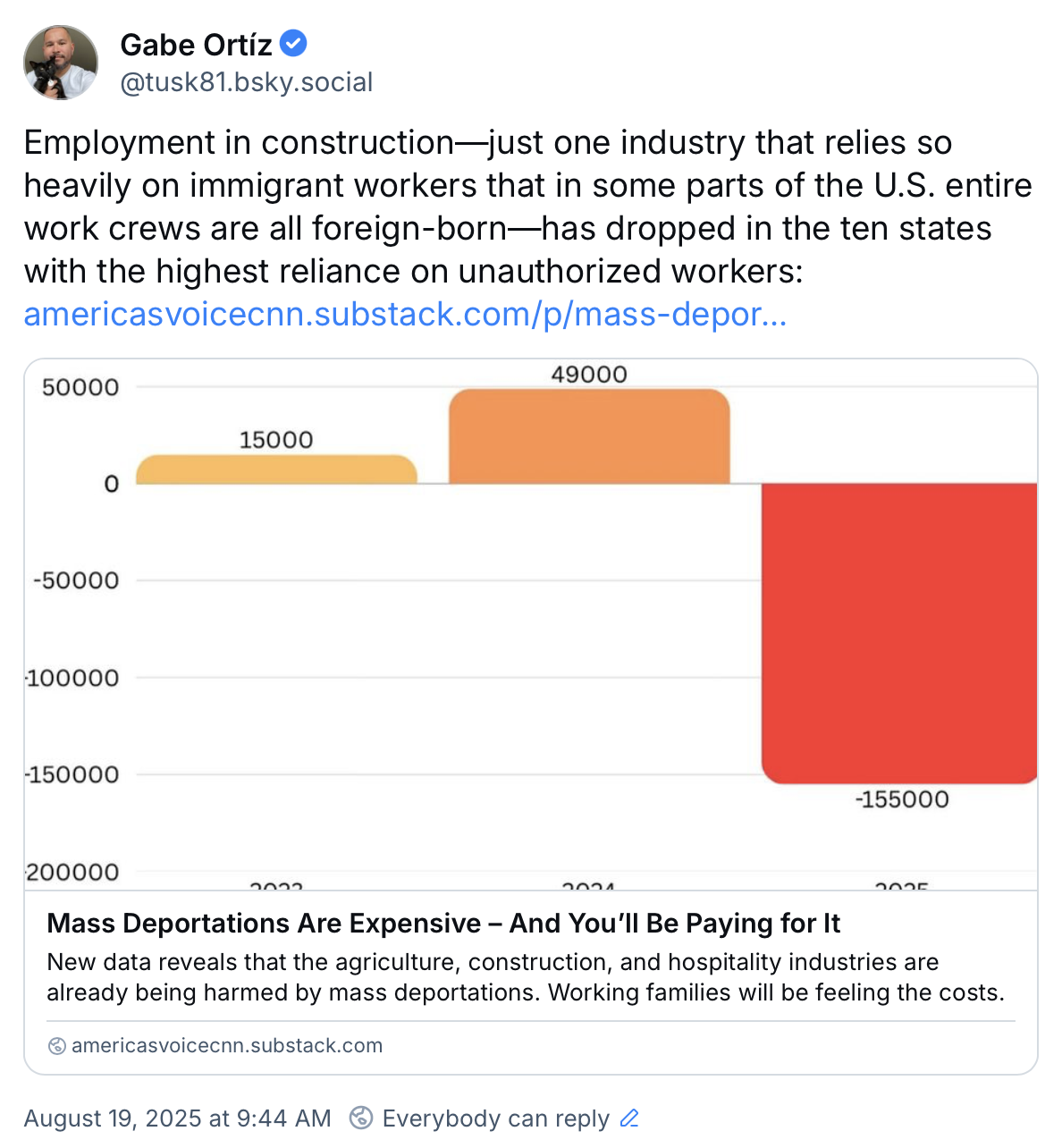 And make no mistake, we’re already seeing the entirely predictable harms that stem from the brutal targeting of the workers who help run our country’s economy. Experts Michael Ettlinger, Robert Lynch and Emma Sifre of Economic Insights and Research Consulting noted shifts in key industries that depend heavily on immigrant workers, such as agriculture. They found that employment in this industry plummeted from March to July 2025, reversing two years of growth seen toward the second half of the Biden administration.