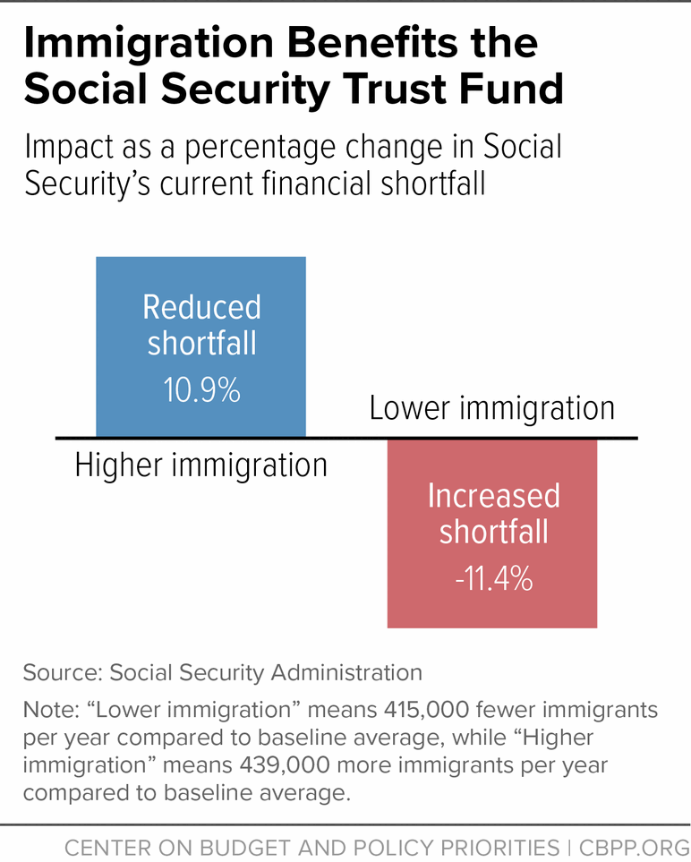 $215.8 BILLION: The amount that immigrants contributed to Social Security in 2023 according to AIC. Last year, the Center on Budget and Policy Priorities noted a Social Security trustees’ report highlighting how immigration actually “improves the trust fund’s solvency” for all. That report noted that higher levels of immigration “help the trust fund balances” while decreased levels will only “increase the funding shortfall.”